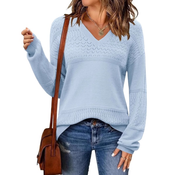 商品属性 [111] Sweater [222] Knitwear [333] Women's Knit Sweater [上市年份/季节] 2025年春季 [主要下游销售地区1] 欧美 [主要下游销售地区2] 欧美 [厚薄] 中等 [图案] 纯色 [工艺] 针织 [是否跨境货源] 是 [款式] 套头 [流行元素] 勾花 [版型] 宽松型 [穿着方式] 套头 [组合形式] 单件 [衣长] 普通款(50cm<衣长≤65cm) [袖型] 常规袖 [袖长] 长袖 [跨境风格类型] 气质优雅 [门襟] 无扣 [面料名称] 化纤混纺 [领型] V字领 [风格] 性感风 [风格类型] 私服名媛