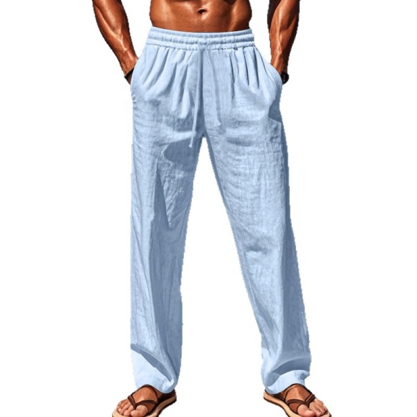 商品属性 [上市年份/季节] 2025夏季 [主要下游平台] ebay,亚马逊,wish,速卖通,独立站,LAZADA,其他 [主要销售地区] 非洲,欧洲,南美,东南亚,北美,东北亚,中东,其他 [主面料成分] 亚麻 [主面料成分的含量] 95 [厚薄] 普通 [原创设计货源] 是 [图案] 纯色 [工艺] 针织 [库存类型] 整单 [弹力] 无弹 [是否库存] 是 [是否有腰带] 无腰带 [是否跨境出口专供货源] 是 [有可授权的自有品牌] 否 [有无质检报告] 否 [材质功能] 免烫 [款式] 长筒裤 [款式细节] 口袋装饰 [淘货类别] 时尚都市(24-35岁) [类别] 运动休闲裤 [腰型] 中腰 [裤型] 直筒型 [裤脚口款式] 直筒 [裤长] 长裤 [裤门襟] 系绳闭襟 [误差范围] 1-3CM [货源类别] 现货 [质检报告编号] 000000 [适合人群] 青年 [适合季节] 夏季 [适用场景] 休闲 [面料] 麻 [面料名称] 麻 [风格] 轻熟休闲