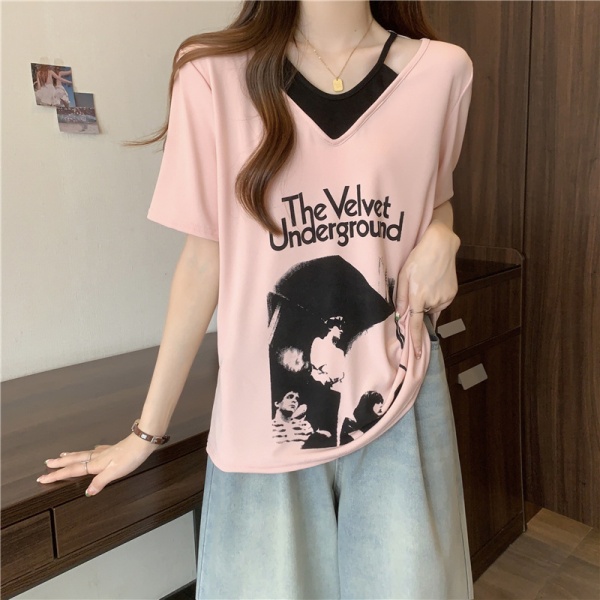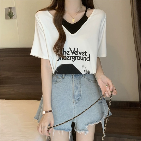商品属性 [上市年份/季节] 2024年夏季 [主要下游销售地区1] 东南亚 [主要下游销售地区2] 欧美 [主面料成分] 涤纶(聚酯纤维) [主面料成分含量] 95%及以上 [图案] 几何图案 [工艺] 拼贴/拼接 [是否跨境货源] 是 [款式] 假两件套 [流行元素] 系带 [版型] 宽松型 [衣长] 普通款(50cm<衣长≤65cm) [袖型] 常规袖 [袖长] 短袖 [跨境风格类型] 甜美清新 [面料名称] 涤纶 [领型] V字领 [风格] 甜美风 [风格类型] 清新甜美